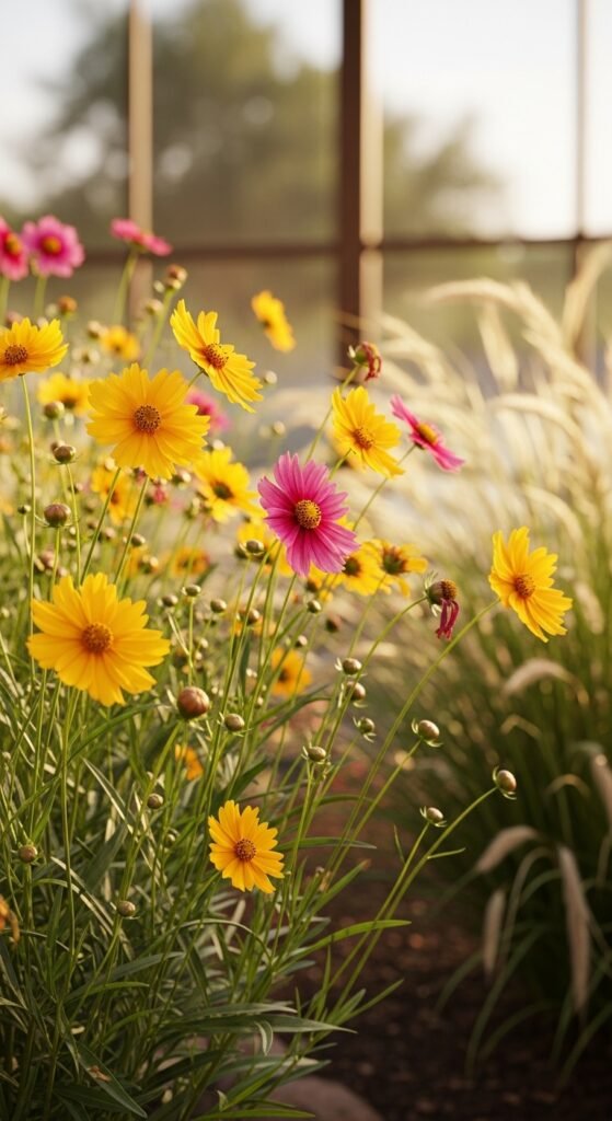 Coreopsis, known as tickseed, features bright yellow or pink flowers on slender stems, adding a meadow-like feel. It’s highly adaptable to drought once rooted.