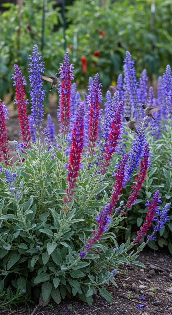 Salvia offers tubular flowers in vibrant blues, reds, or purples, beloved by hummingbirds. Many varieties are drought tolerant, originating from dry habitats.
