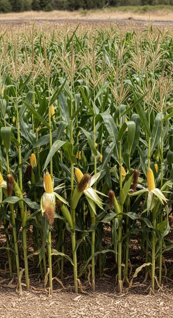 Plant in blocks for pollination in full sun, spacing 12 inches apart. Mulch rows and use xeriscape ideas around. Water consistently early, reducing later. Harvest when silks brown. This staple crop adapts well to water-wise methods.