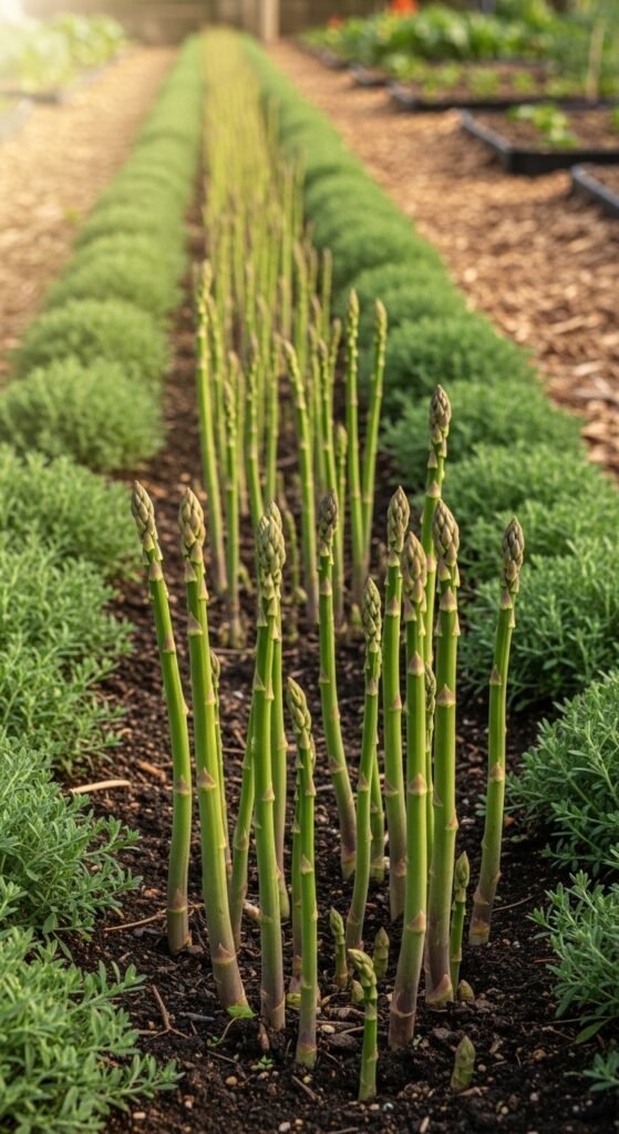 Plant crowns in trenches in full sun, spacing 18 inches. Mulch deeply; see mulching vegetable garden. Water new beds, then minimally. Harvest spears in year three. This long-term investment pays off in low-maintenance harvests.