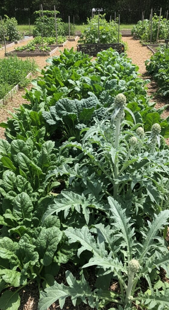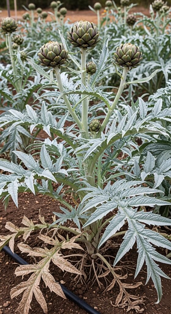 Artichokes, thistle-like perennials, have silver foliage that reflects heat, aiding drought tolerance in Mediterranean climates.