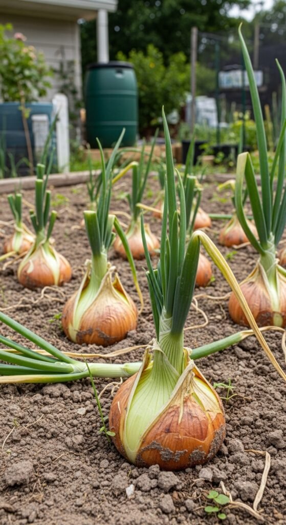 Plant sets or seeds in full sun, spacing 4 inches. Use mulch and rain barrel setup for efficiency. Water moderately until bulbing. Harvest when tops fall. This staple adds flavor without high water use.