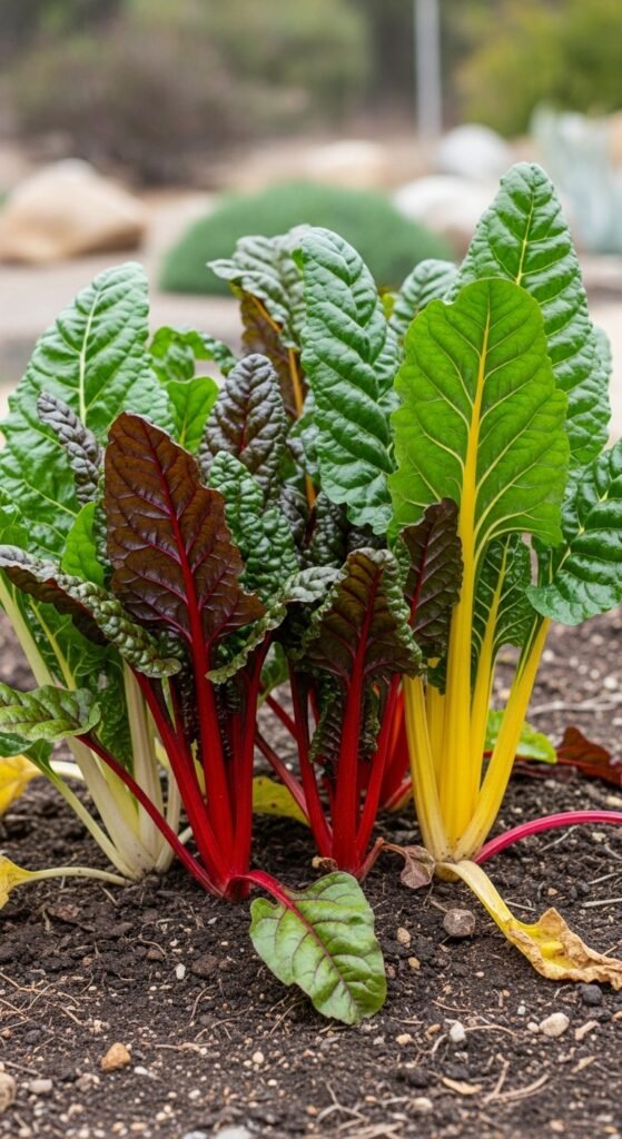 Swiss chard, a leafy green related to beets, offers colorful stems and nutritious leaves that grow well with limited water. Its deep roots and waxy foliage help it endure dry spells, making it a reliable choice for sustainable gardening.