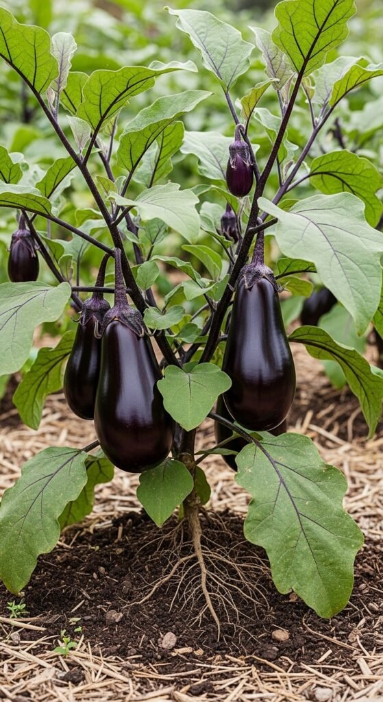 Eggplant, a nightshade family member, produces glossy fruits in various shapes and colors, adapted to warm, dry Mediterranean climates. Its deep roots and leathery leaves help it conserve water effectively.