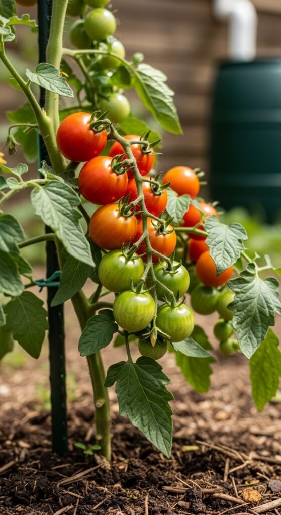Plant in full sun, staking or caging for support, spaced 24 inches apart. Incorporate compost and mulch for moisture retention. For water-saving tips, refer to rain barrel setup. Water at the base to prevent disease. Pick ripe fruits daily to encourage more. These vigorous vines thrive in dry conditions, offering bountiful yields.