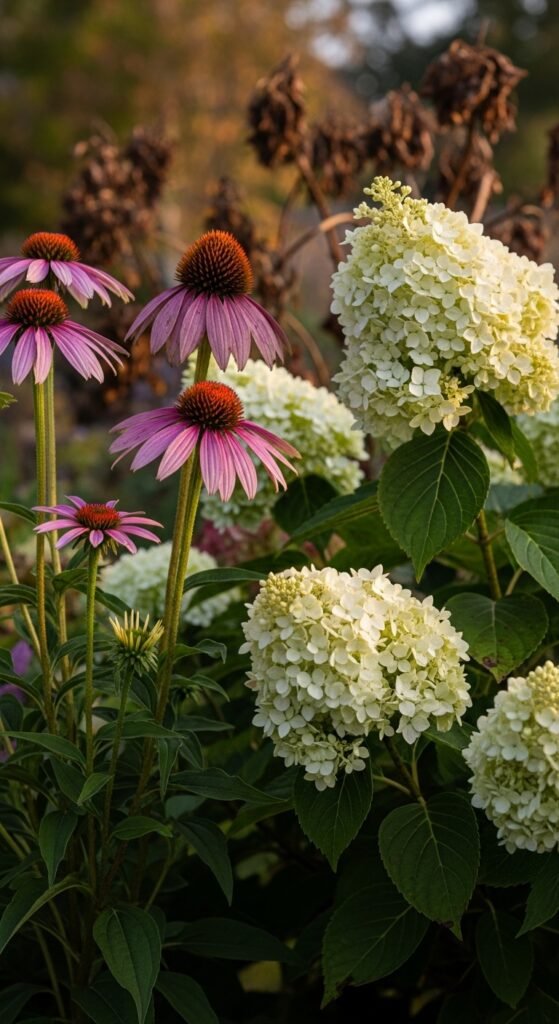You’ll get bold summer statements with hydrangea’s large mopheads beside echinacea’s cones, perfect for shaded borders. What defines it is hydrangea’s fall persistence, adding texture.