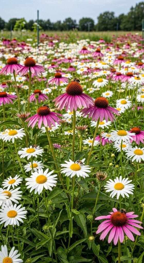 Mass plant shasta daisies with echinacea for a cheerful cottage meadow. What shines is the white petals echoing coneflower shapes.