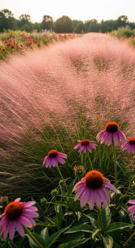 Imagine the airy, pinkish plumes of muhly grass swaying alongside your echinacea’s sturdy bloomsβ€”this ornamental grass adds a soft, ethereal backdrop that enhances movement in your garden. What defines this pairing is muhly’s fine texture and fall color show, turning vibrant pink or red, complementing echinacea’s summer flowers in prairie or naturalistic landscapes.