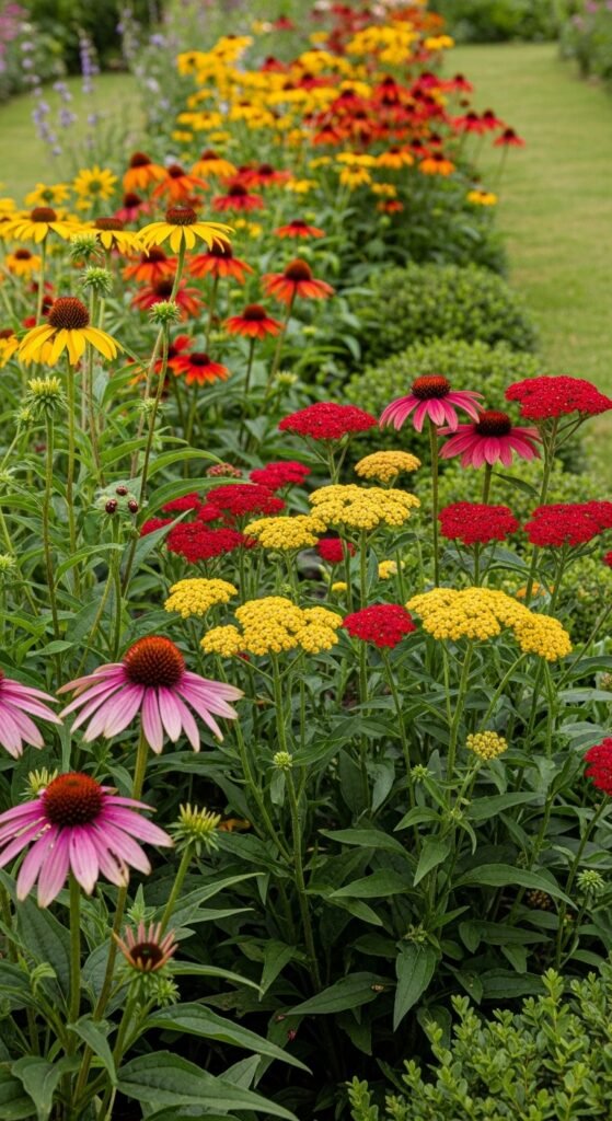 You can create a colorful, low-growing hedge by combining echinacea with yarrow, whose flat-topped clusters in reds, yellows, or whites mingle perfectly with coneflower petals. What stands out is yarrow’s fern-like foliage, adding fine texture and ground cover that fills gaps around echinacea’s taller stems in borders or meadows.