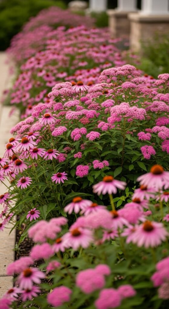 You’ll achieve a layered hedge effect by planting echinacea with spirea, a shrub whose clustered pink or white flowers provide a bushy foundation for coneflower’s upright form. What distinguishes this is spirea’s mounded habit, offering structure in mixed borders or foundation plantings.