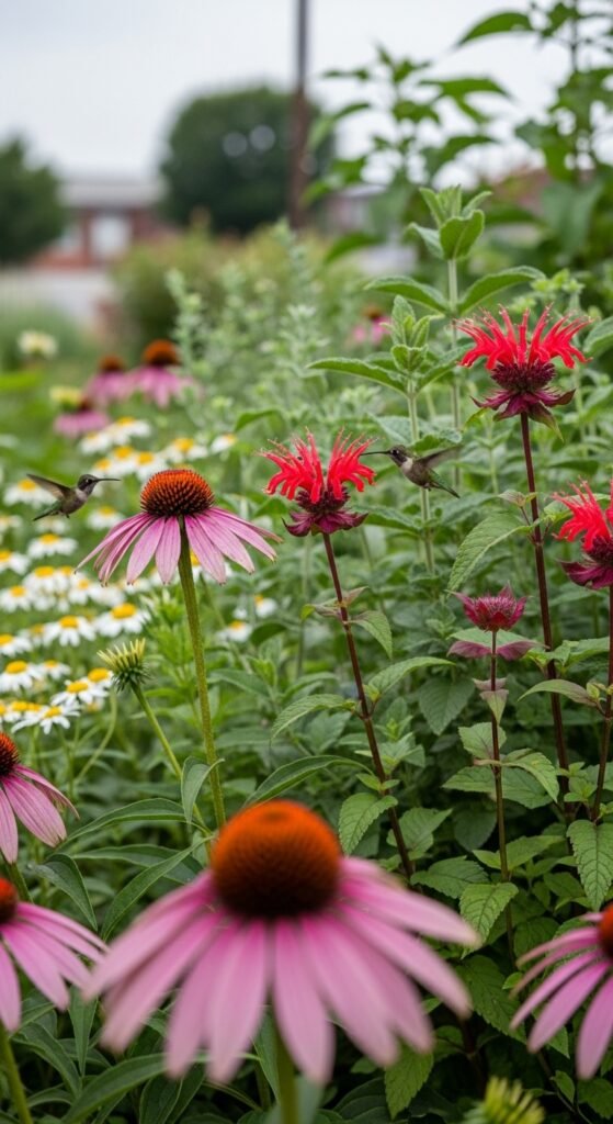 Combine echinacea with bee balm for a buzzing pollinator haven, where tubular red or pink flowers attract hummingbirds alongside coneflower’s daisy heads. What sets this apart is bee balm’s aromatic foliage, adding scent and repelling some pests in herb or cottage gardens.