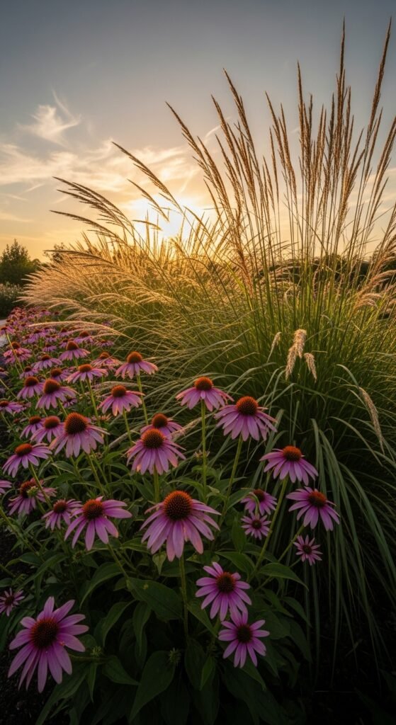 You can add graceful movement with maiden grass’s arching blades behind echinacea, creating a naturalistic screen or backdrop in large landscapes. What highlights this is the grass’s feathery plumes in fall, contrasting coneflower’s bold colors.