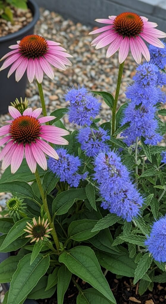 Pair echinacea with bluebeard’s blue blooms for a cool-toned contrast, ideal in dry, sunny borders or containers. What makes it unique is bluebeard’s late-summer flowers, extending the display.