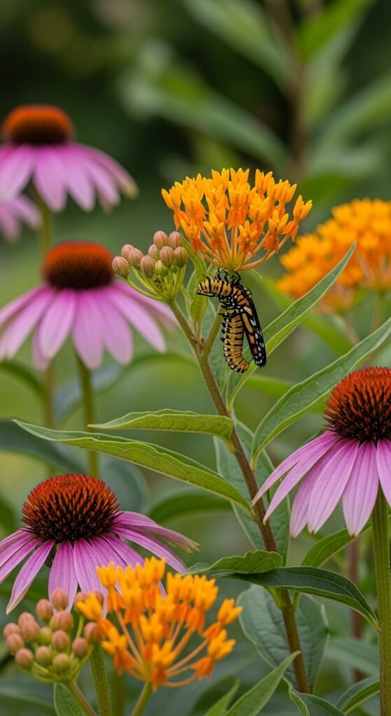 Create a butterfly nursery by planting milkweed with echinacea, where orange or pink clusters host monarchs. What stands out is milkweed’s role as a larval host, complementing coneflower’s nectar.