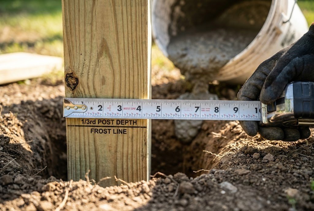 A general rule is to bury 1/3 of the post's total length. For a 6-foot tall fence, you need an 8-foot post (2 feet buried) or preferably a 9-10 foot post (3+ feet buried) for stability, especially in windy areas or frost zones.
