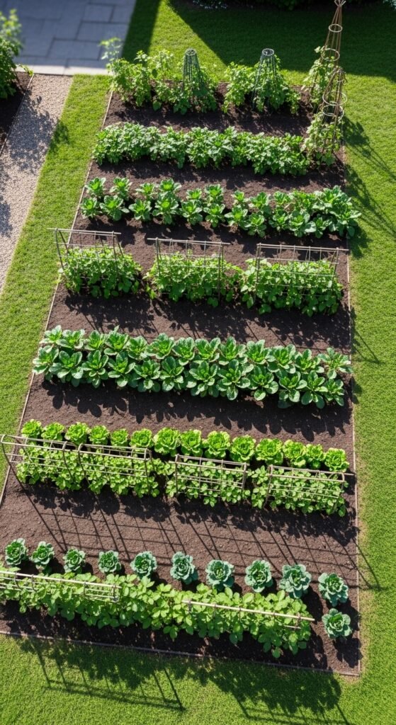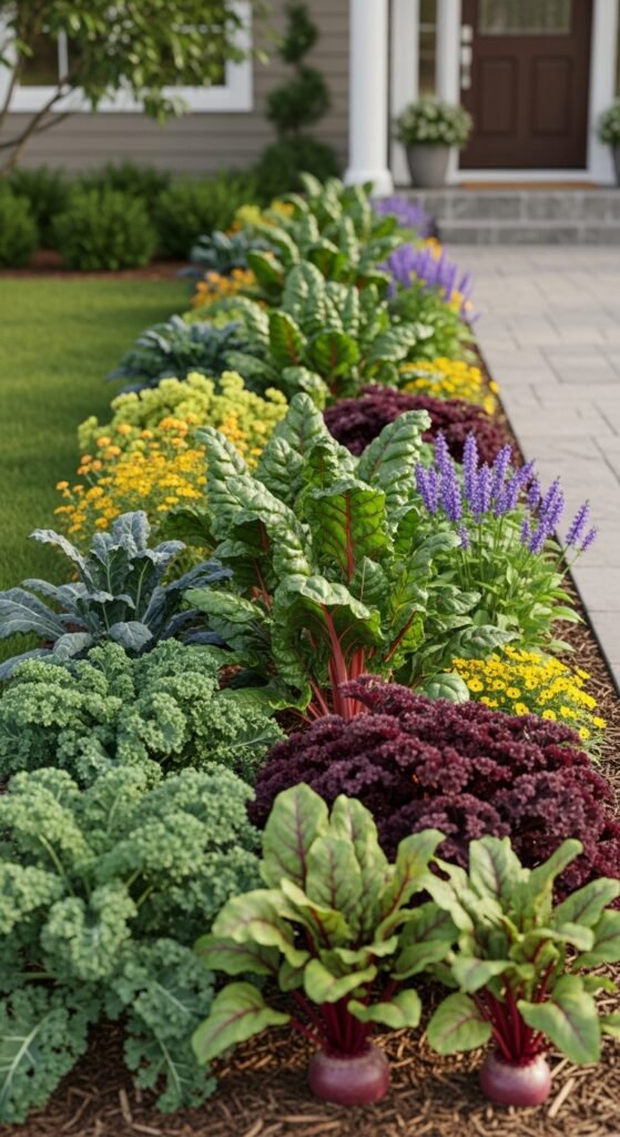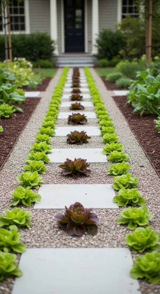 Why it’s beneficial: It maximizes edge spaces, deters weeds naturally, and creates a welcoming entryway. The mix of textures and colors from veggies enhances aesthetics, while providing easy access for harvesting fresh greens without venturing deep into the yard.