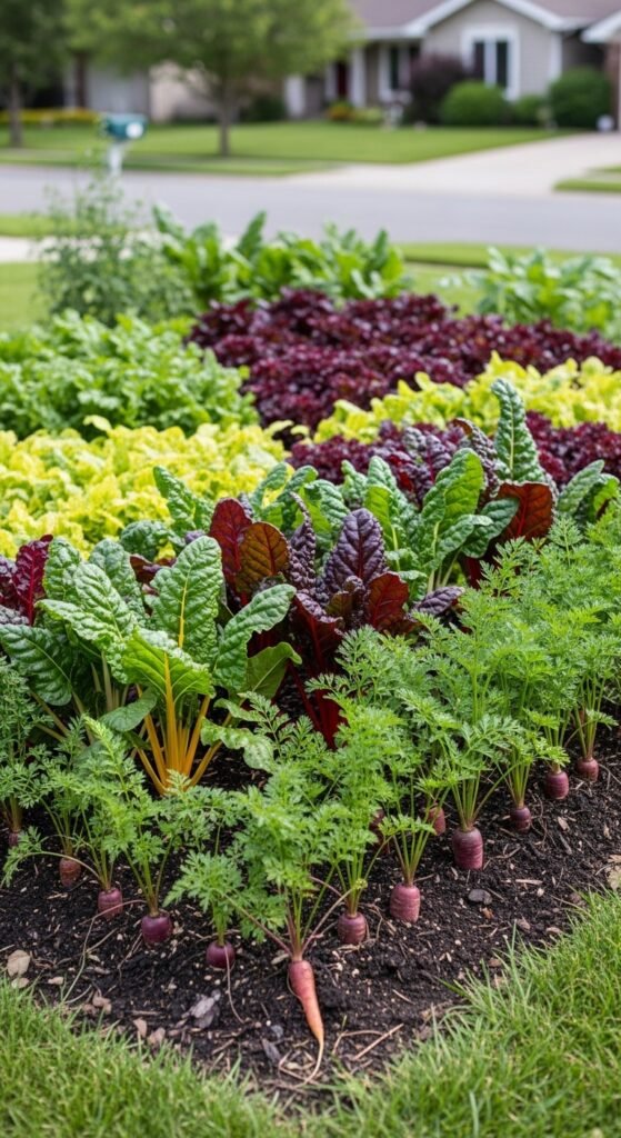 What this array showcases is colorful veggies like rainbow chard and purple carrots mixed for beauty in your front yard vegetable garden.