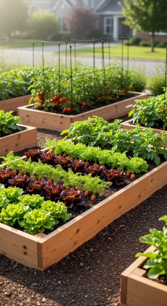 What makes a raised bed setup ideal for your front yard vegetable garden is its elevated structure, which improves drainage and soil quality while keeping things neat and contained. You can plant tomatoes, carrots, and lettuce in organized rows, surrounded by low borders for a tidy look.