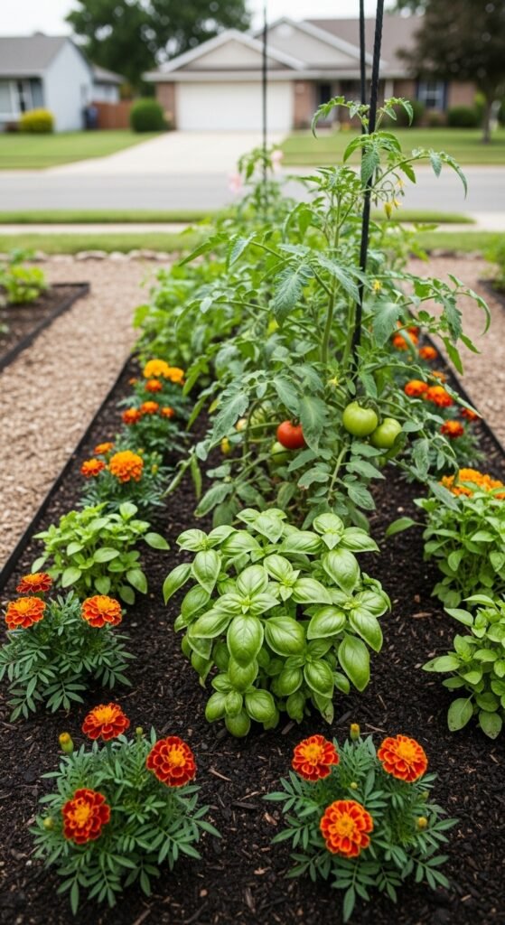 What this approach involves is interplanting compatible veggies, like tomatoes with basil and marigolds, in your front yard to boost health and productivity.