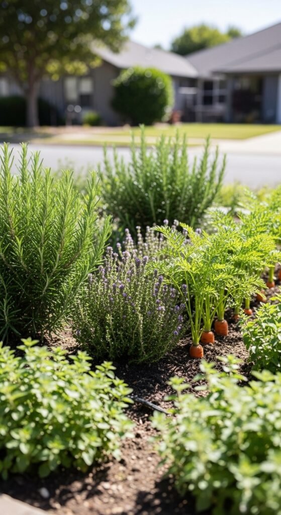 What sets this apart is incorporating herbs like rosemary, thyme, and oregano among vegetables in your front yard, creating a fragrant, multi-use space.