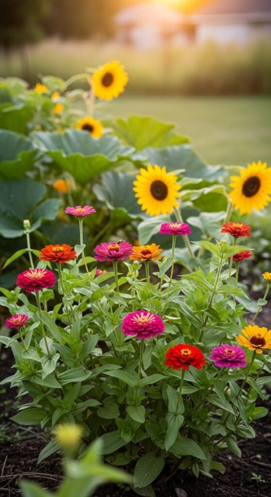 What makes this plot special is adding flowers like zinnias and sunflowers amid veggies to attract bees and butterflies in your front yard vegetable garden.