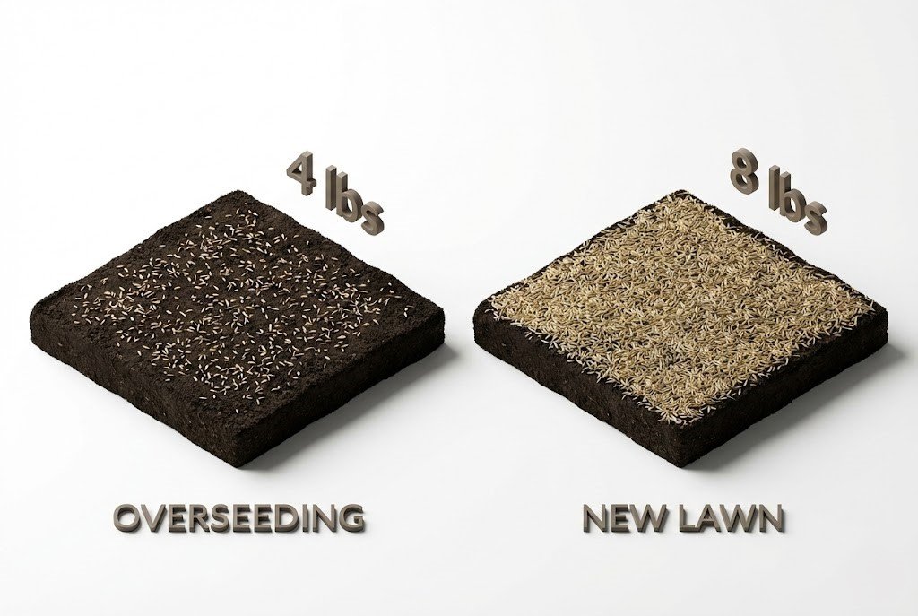 - Overseeding (4 lbs / 1000 sq ft): When you are just filling in gaps, applying too much seed creates competition for resources. Our tool cuts the rate in half to save you money while ensuring success.