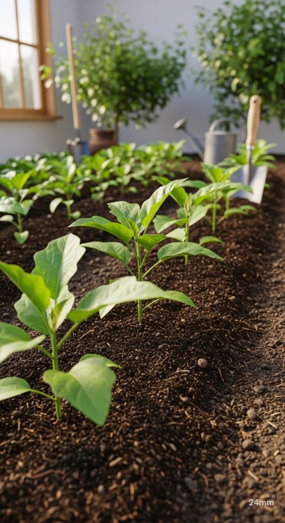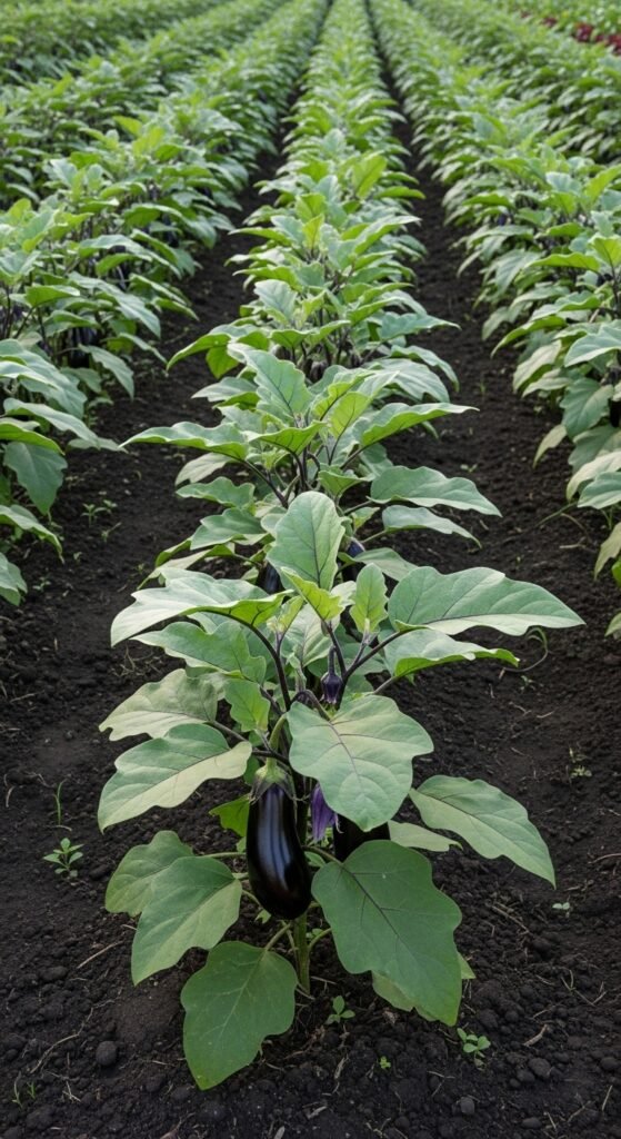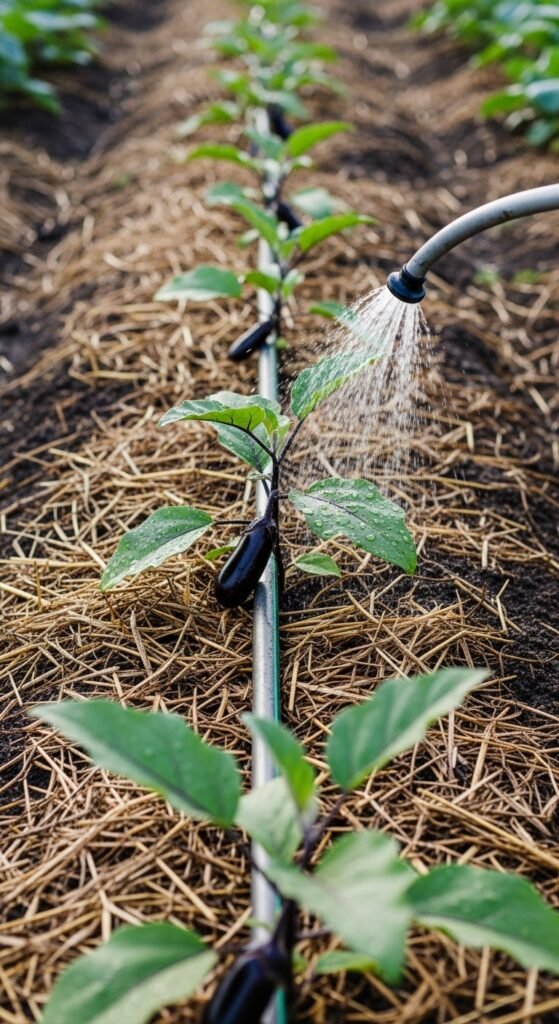 Mulch prevents evaporation and erosion, maintaining ideal conditions for eggplant growth.