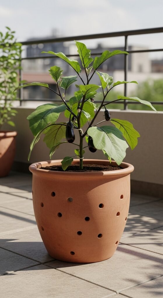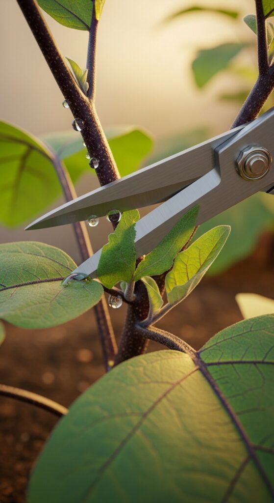 Remove lower leaves and suckers to improve circulation and focus energy on fruits. Pruning results in larger eggplants and reduced disease.