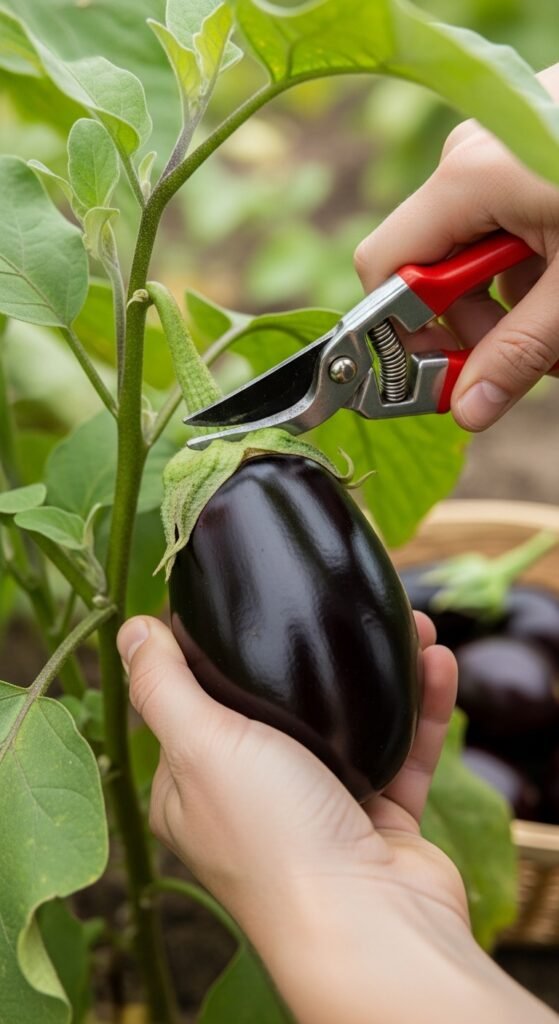 Pick eggplants when glossy and firm, about 4-6 inches long. Regular harvesting encourages continuous production throughout the season.