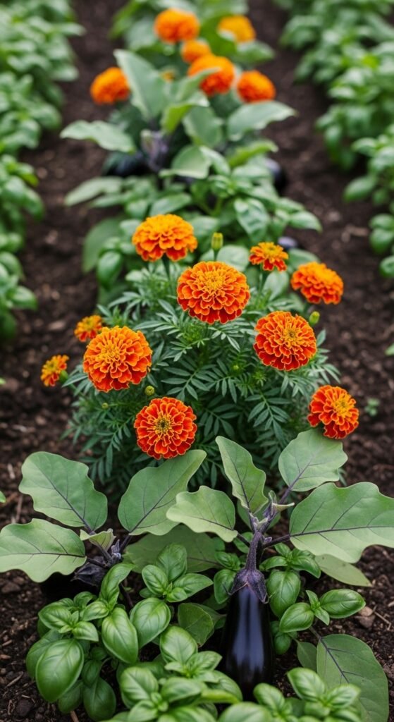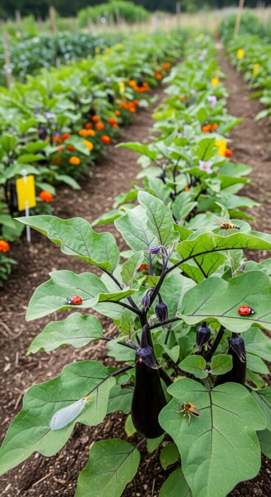 Pair eggplants with basil or marigolds to deter pests and enhance flavor. This natural method promotes biodiversity and pest resistance in your garden.