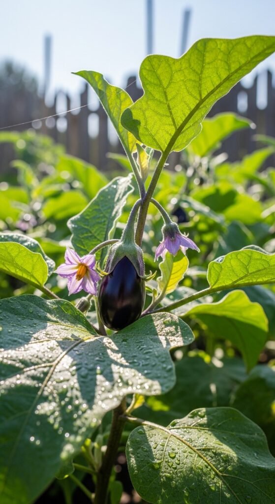Consistent watering avoids stress that leads to bitter fruits or dropped buds. Eggplants are thirsty plants, especially during flowering.