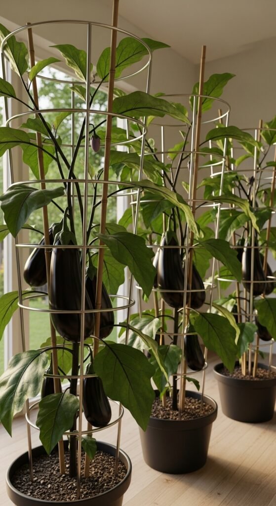 Stake or cage your eggplants to support heavy fruits and prevent stem breakage. This ensures upright growth and easier access for picking. Use tomato cages or bamboo stakes for stability.