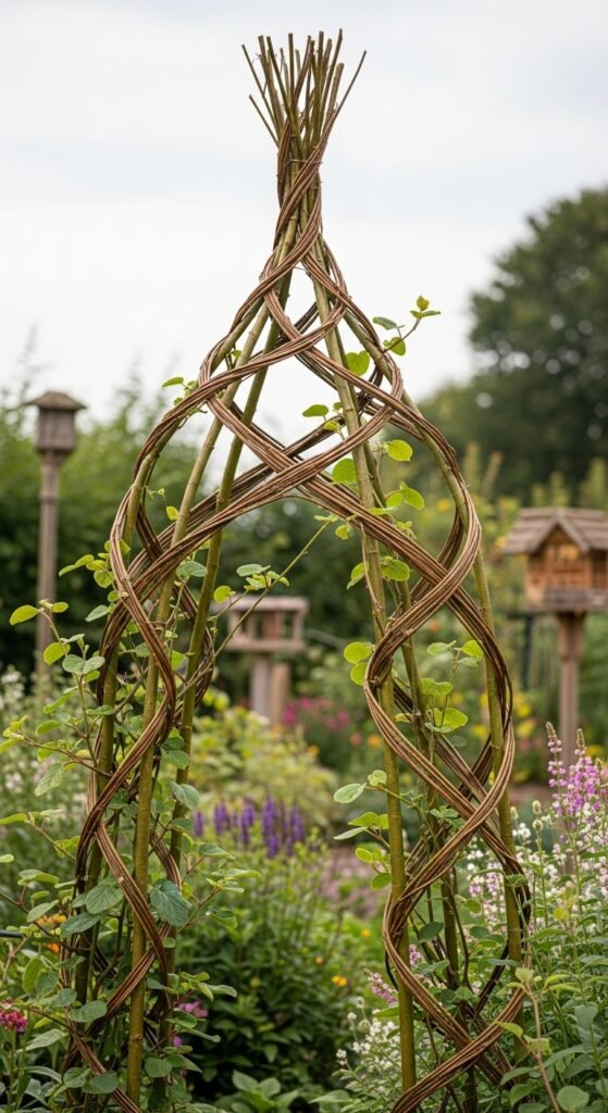 Plant willow cuttings in a frame shape, weaving as they grow. Interplant kiwi at the base. For living structures, consider indoor trellis ideas for scaled-down versions.