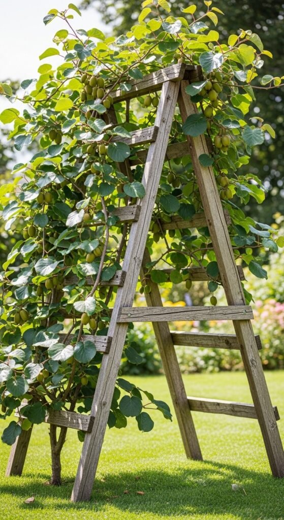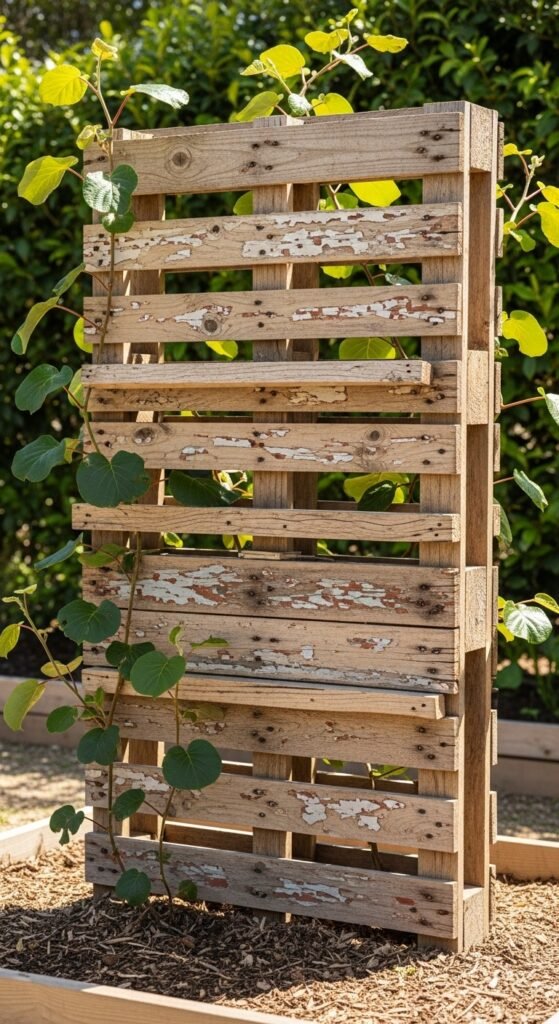 Repurpose wooden pallets into a vertical trellis by standing them upright and adding wire or slats for hardy kiwi vines to climb.