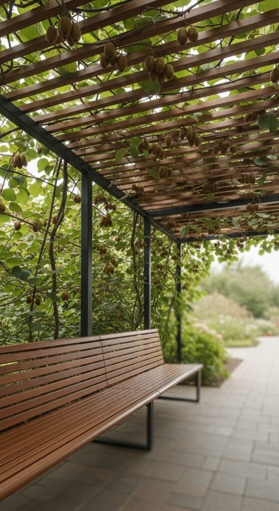 Integrate a bench beneath an arbor trellis, where hardy kiwi vines cover the overhead slats, creating a shaded seating area with functional support.