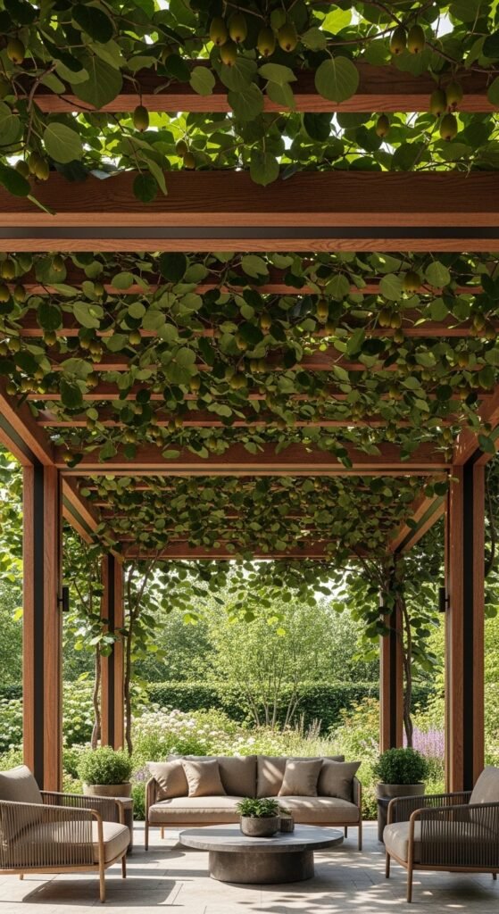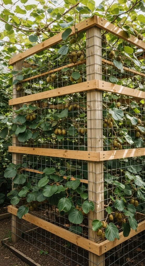 A pergola-style trellis creates an elegant overhead canopy, perfect for shading patios while supporting hardy kiwi vines. Built with vertical posts and horizontal beams, it allows vines to spread across the top, forming a lush green roof.