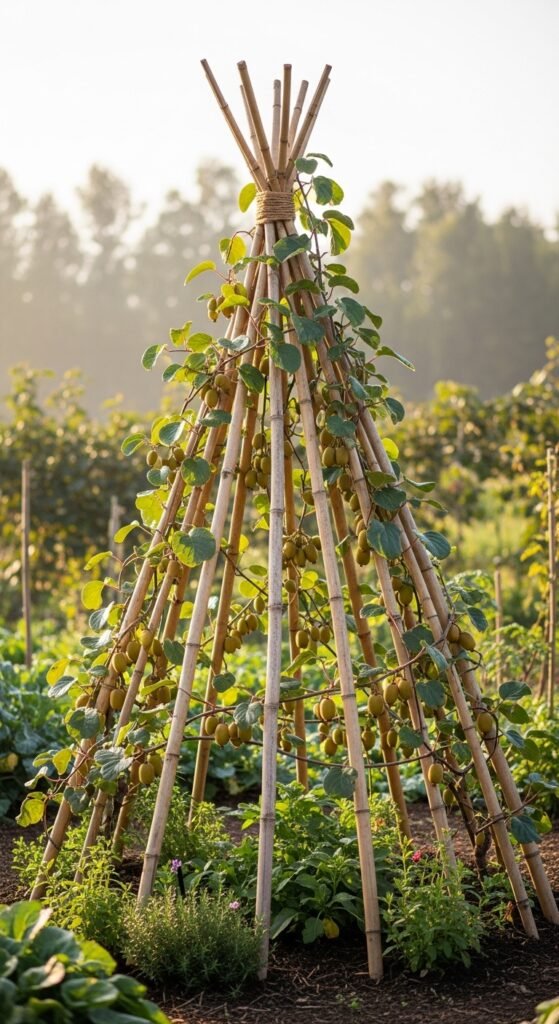 A rustic bamboo teepee trellis uses bundled poles tied at the top to form a conical structure, offering natural, eco-friendly support for hardy kiwi vines to spiral upward.