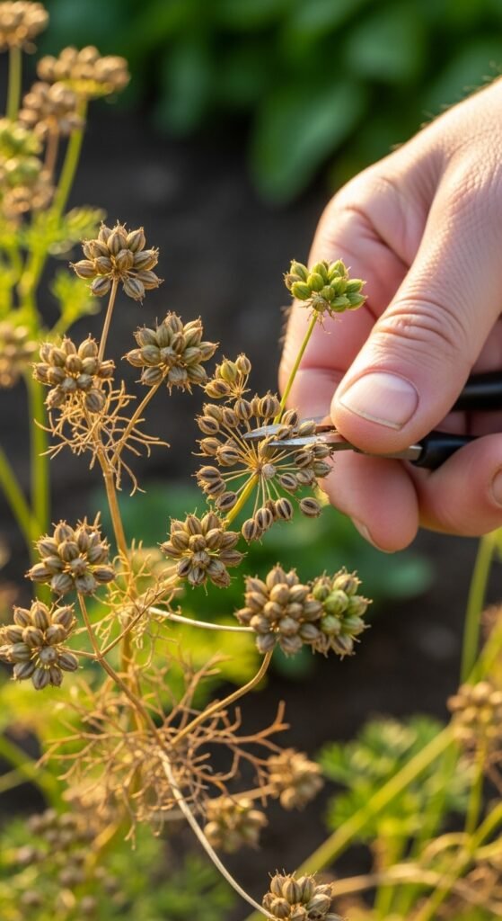 Harvest mature seed heads from herbs like coriander to save for future planting or spice use. This sustains your garden cycle economically. Seeds retain viability when stored properly, offering self-sufficiency. Cut heads when brown and dry them indoors. This idea aligns with lists of perennial herbs, aiding in variety selection.
