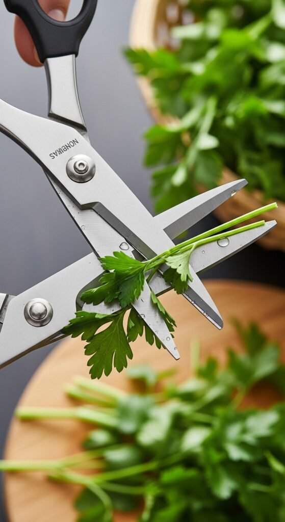 Employ dedicated herb scissors to make precise, clean cuts that minimize plant trauma. This tool choice prevents tearing, which can invite disease. The result is healthier regrowth and sustained productivity. Sanitize blades between uses to avoid cross-contamination. For delicate herbs like parsley, multiple blades speed up the process. This idea integrates seamlessly with soil management practices, such as using a specialized soil mix for herbs, to foster robust plants.