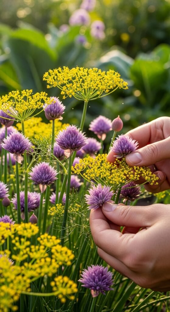 You can harvest herb flowers, such as those from chives or dill, to add unique flavors to dishes while controlling seed production. This prevents bolting and extends vegetative growth. Flowers offer culinary versatility, from garnishes to infusions. Pick them young and fresh, just as they open. Dry or use immediately for best results. This technique supports biodiversity in your garden, attracting pollinators and complementing companion planting.