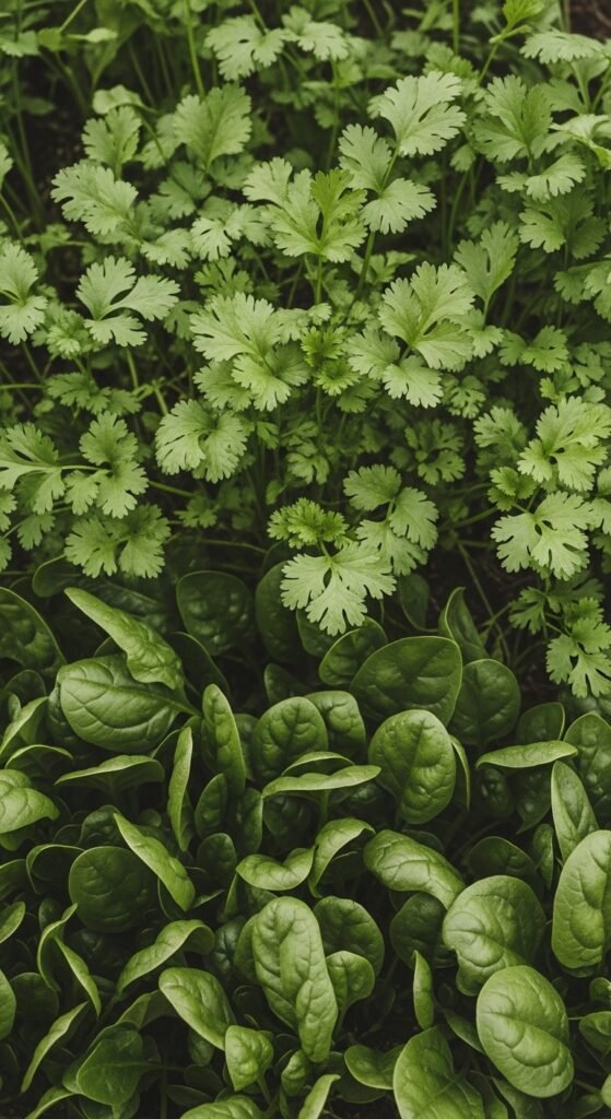 Sow cilantro seeds around spinach, thinning to 6 inches in cool, partial shade. Succession plant for continuous supply, watering evenly. This quick-growing duo suits spring gardens.