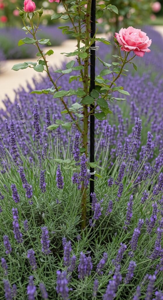 Plant lavender at rose bases, 12 inches apart in sunny, alkaline soil. Prune both post-bloom for health. This ornamental pairing elevates garden aesthetics.