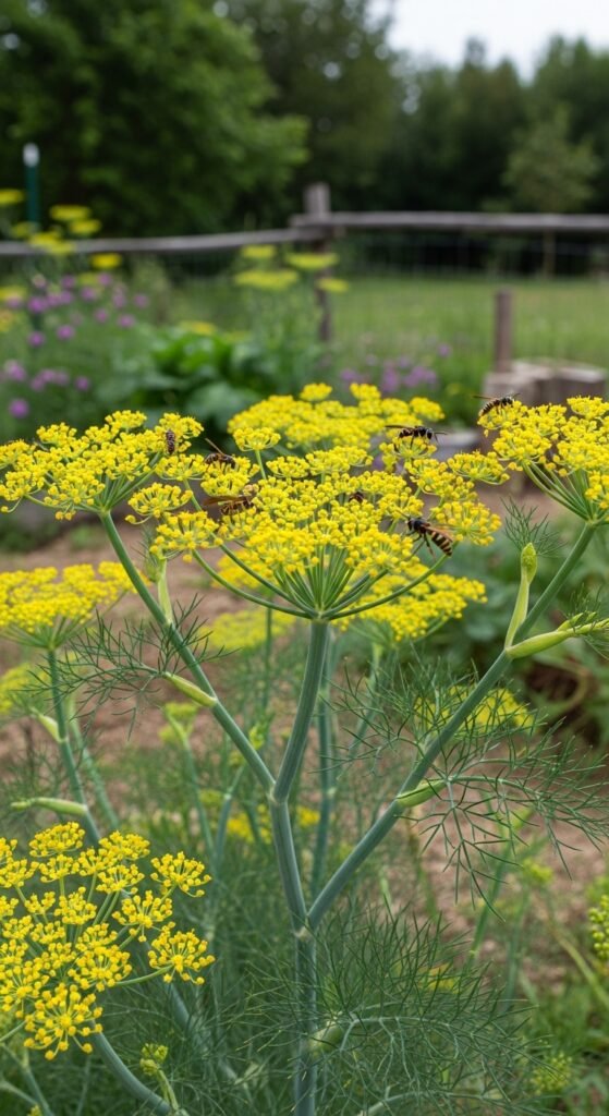 Fennel stands out in the herb companion chart for attracting predatory wasps. Plant it peripherally to draw beneficials without inhibiting others. Benefit from ecosystem balance and pollination boost.