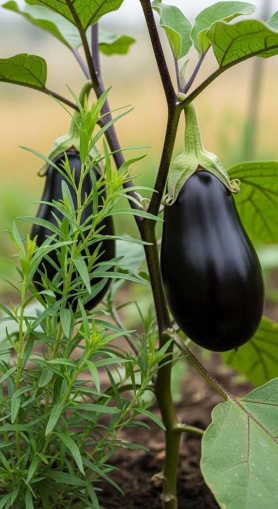 Tarragon enhances eggplant in the chart by improving flavor and deterring pests. Eggplant’s warmth suits tarragon’s needs. Secure taste elevation and growth synergy.