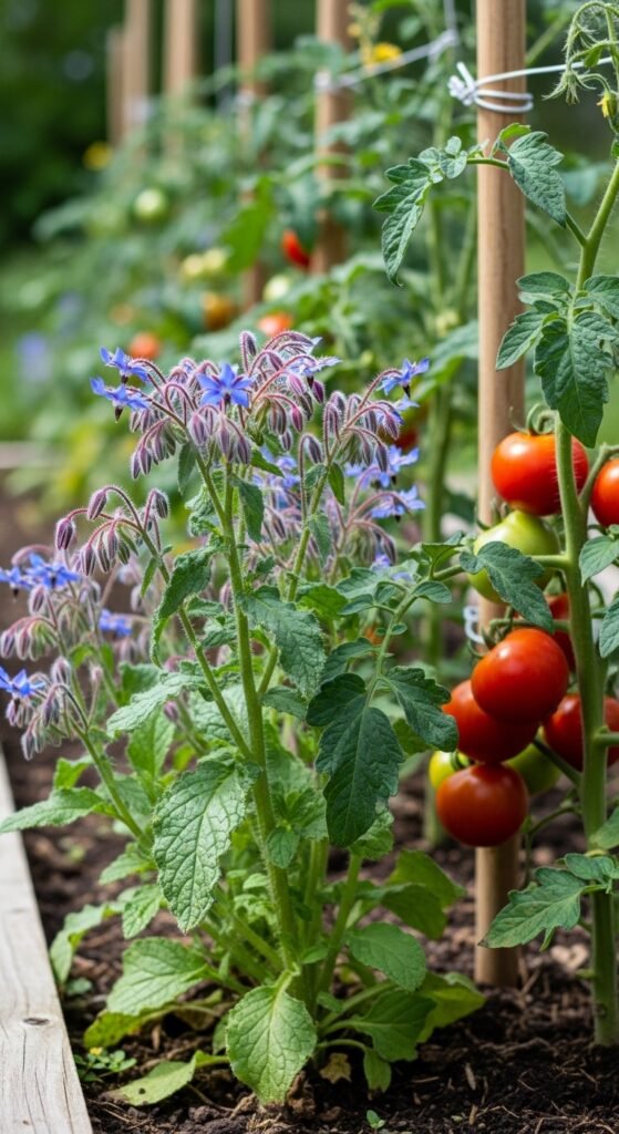 Borage invigorates tomatoes in your herb companion chart, attracting pollinators and improving soil. Tomatoes benefit from increased fruit set. Gain pollination enhancement and soil conditioning.