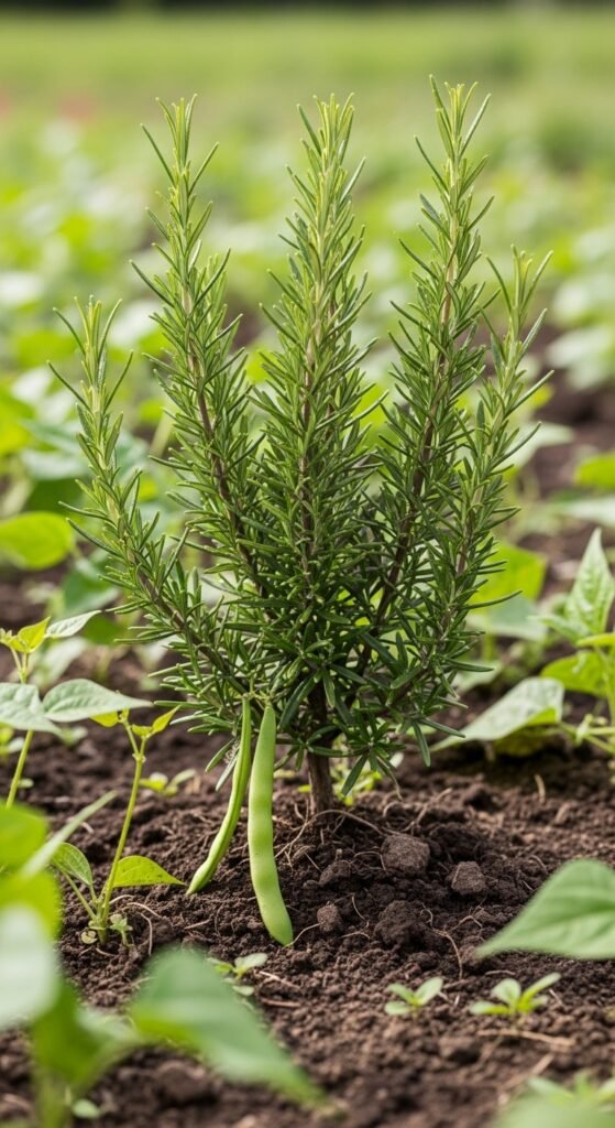 Position rosemary bushes near bean rows, 24 inches apart in full sun. Water at the base to avoid foliage diseases, and mulch for moisture retention. This woody herb adds evergreen interest.