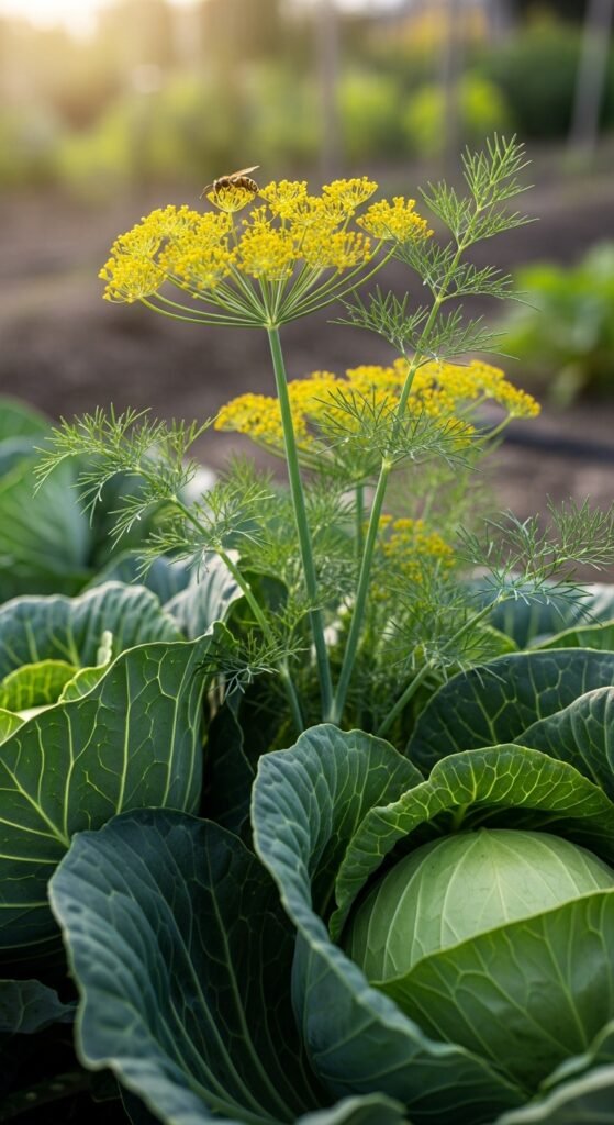 Sow dill seeds directly around cabbage transplants, ensuring 18 inches between plants for airflow. Both prefer cool weather and moist soil, so mulch to retain moisture. Harvest dill fronds before flowering to maintain vigor.