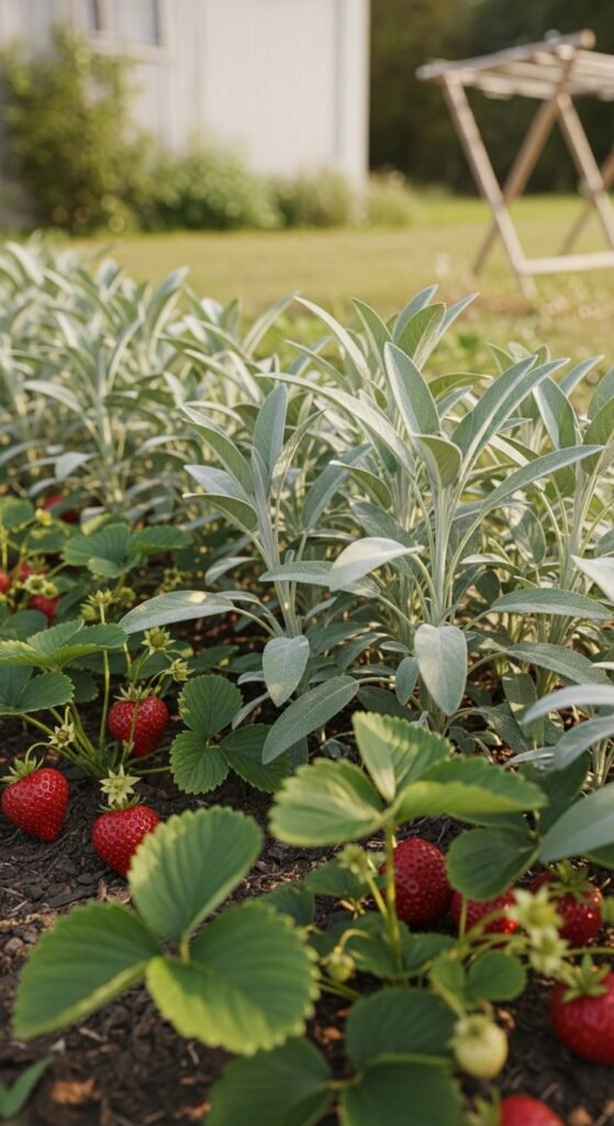 Plant sage around strawberry patches, spacing 18 inches in sunny, dry soil. Trim sage after flowering to maintain shape and vigor. This combo excels in borders or containers.