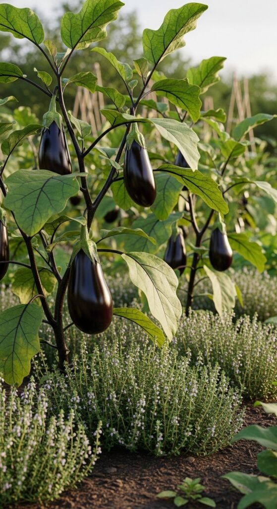 Scatter thyme plants beneath eggplants, 8 inches apart in warm, well-drained spots. Harvest thyme stems regularly to promote bushiness. Both appreciate consistent moisture without sogginess.