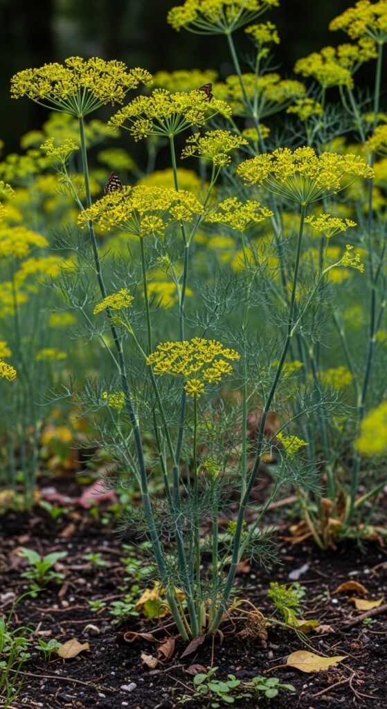 Growing dill in shade offers host plant status for butterflies and versatile seeds for spices. It self-sows readily, ensuring future crops. Its height provides vertical interest in shaded beds.